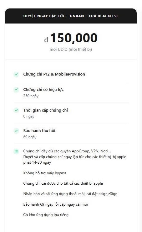 Chứng chỉ P12 & MobileProvision Chứng chỉ có hiệu lực 350 ngày Thời gian cấp chứng chỉ 0 ngày Bảo hành thu hồi 69 ngày
